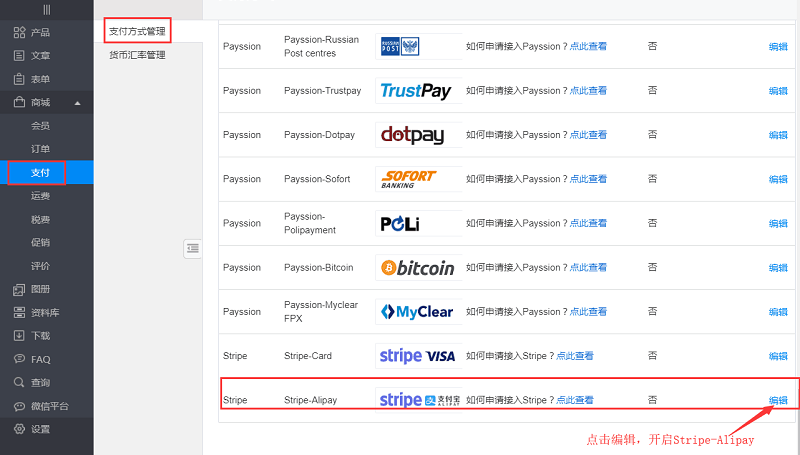 (2)新增功能操作方法:后台商城管理-》支付方式管理-》编辑Stripe-Alipay支付。