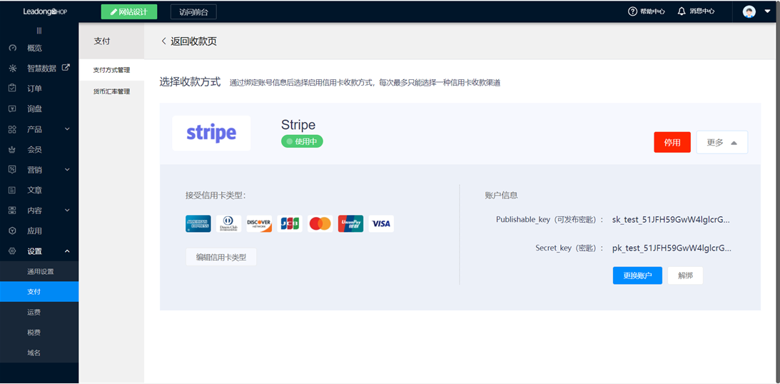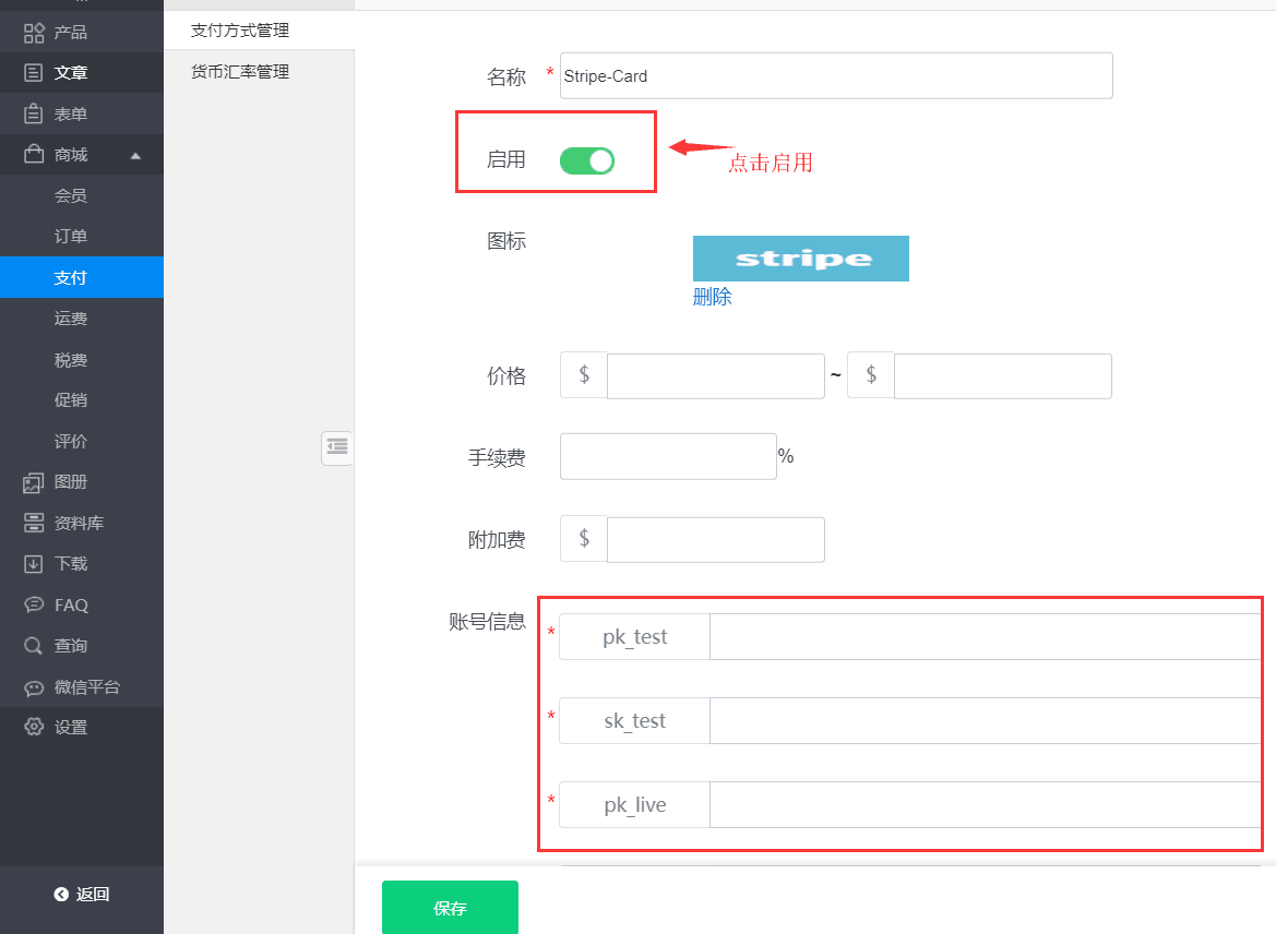 开启Stripe-Card支付并进行相关设置。