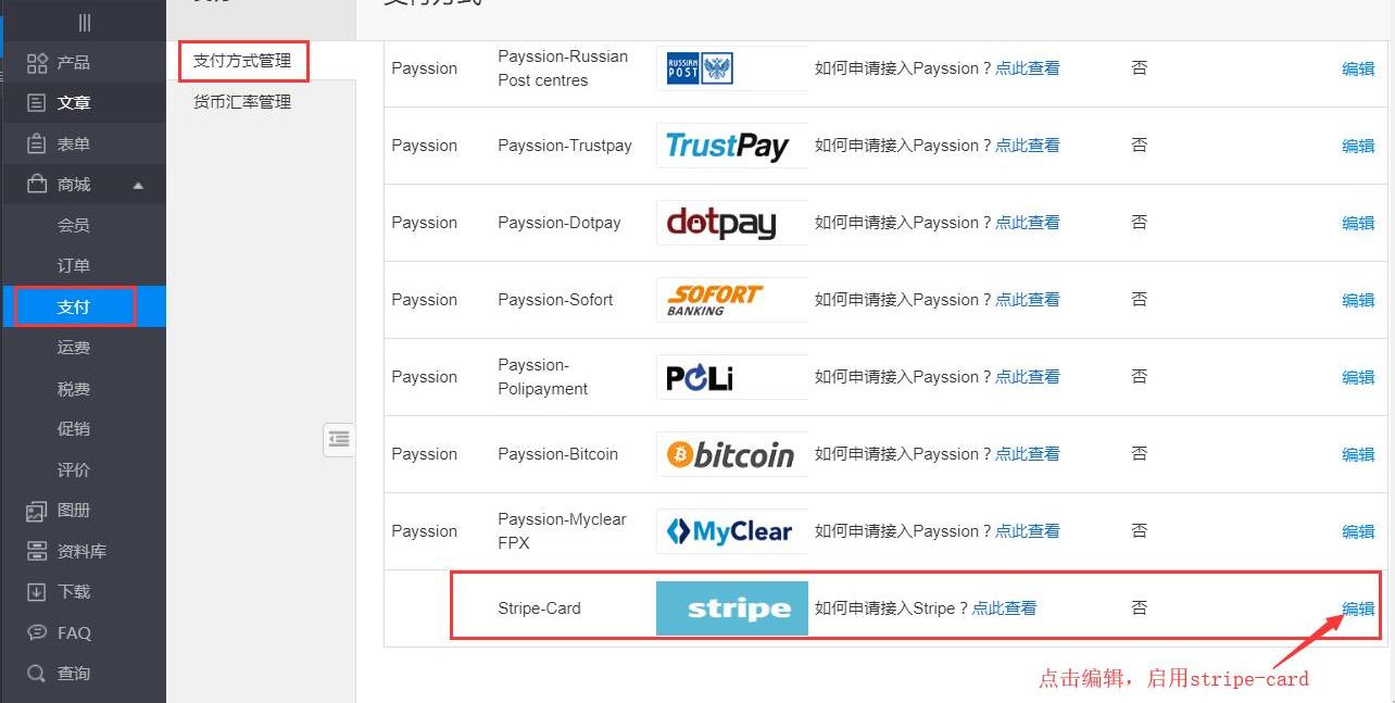 (2)新增功能操作方法:后台商城管理-》支付方式管理-》编辑Stripe-Card支付。