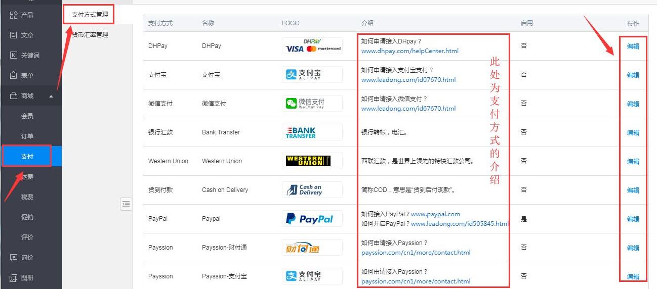 在“支付方式管理”处,可以开启需要的支付方式,对支付方式的介绍,可以参考平台上的介绍链接。在此处必须开启一种支付方式,客户在网站前台才可以成功提交订单或成功支付订单。