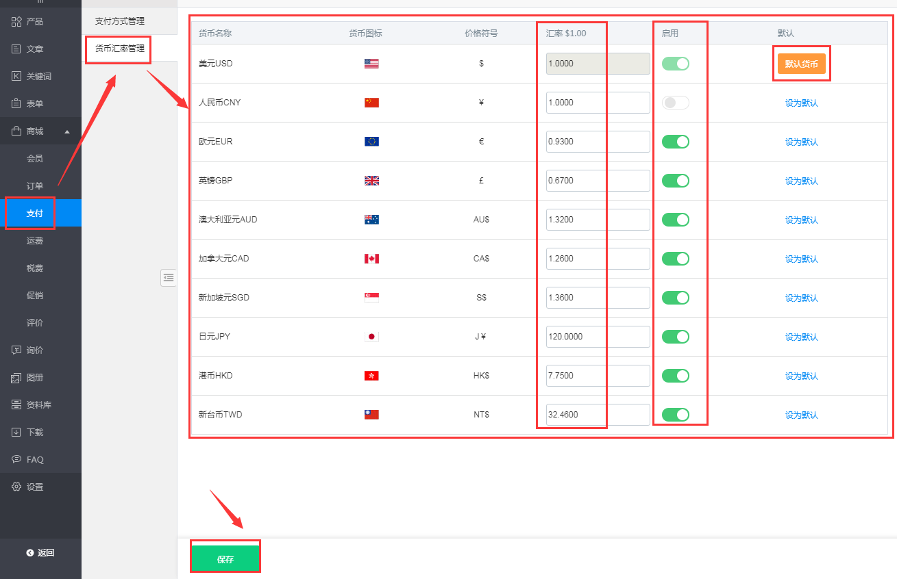针对英文、小语种网站支持设置货币汇率,如下所示。