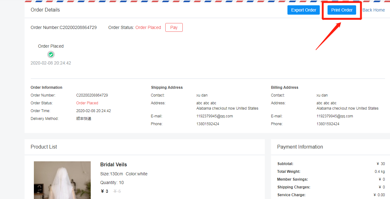 点击后会出现订单详情页面,点击右上角的“Print Order”可以直接调用打印机打印,如下图所示: