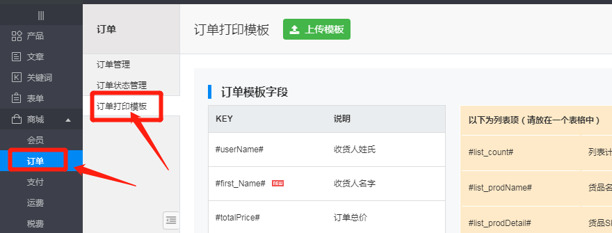 第1步:点击进入“内容管理后台→订单→订单打印模板”,如下图所示: