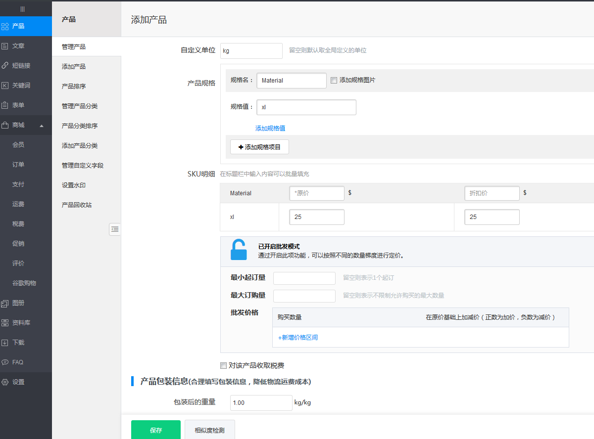 当运费计算方式已经设置成功,前台依旧有保存的情况下。可点击“产品”内的“管理产品”,检查是否是单个产品未设置重量,如果未设置的话,可补充设置一下重量。