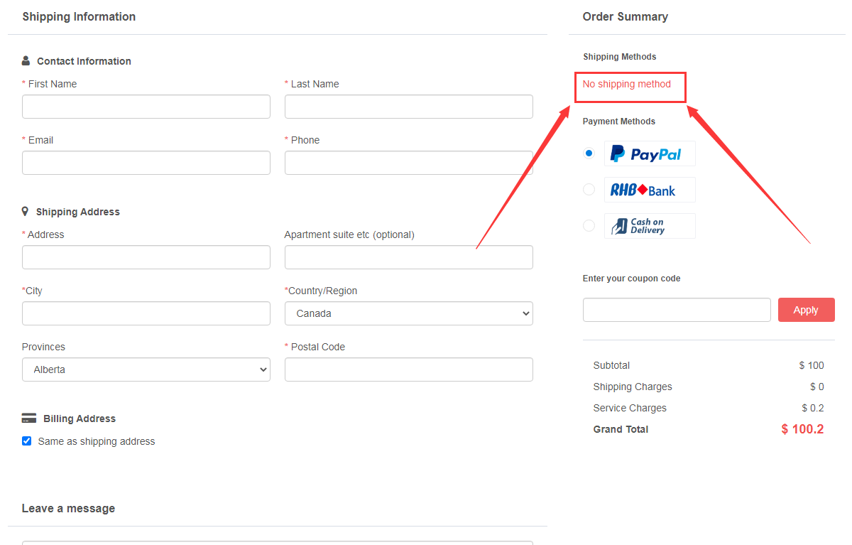 当商城站网站下单时物流显示无可用货运方式提示,如下图提示的红色报错字样,需要检查一下后台的物流设置方式和产品的SKU设置。