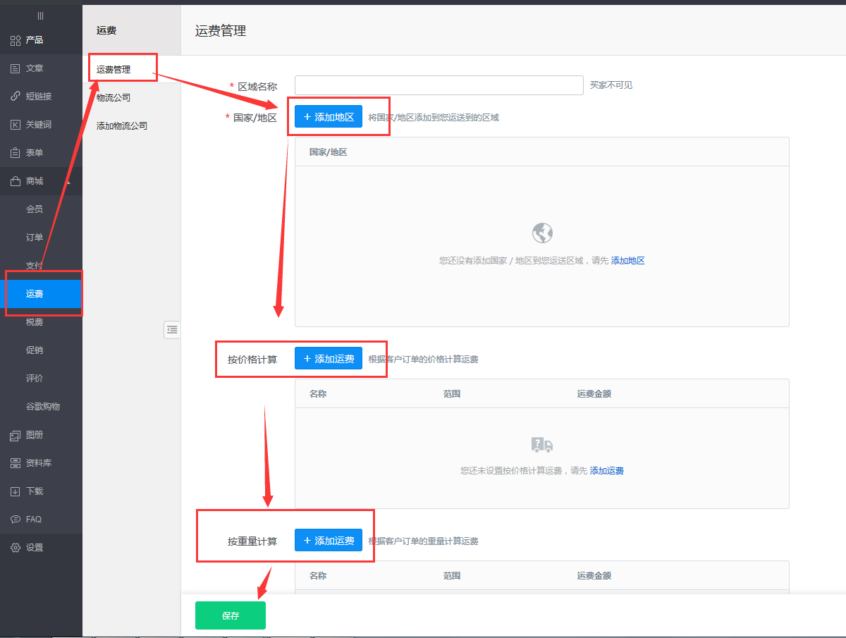 登录网站后台,在“我的应用”页面,点击“内容管理”进入,点击“商城”内的“运费”入口,进入“运费管理”内。检查区域和运费内运送区域和运费计算方式是否有设置完成,如果没有设置完成的话,补充设置即可。