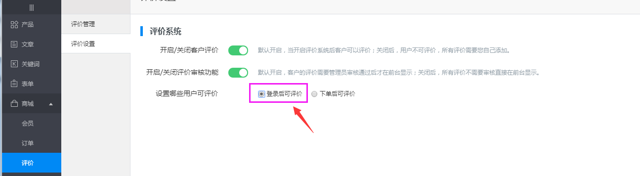 2)支持卖家设置登录后可评价。网站后台设置入口如下图所示: